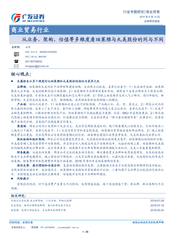 【广发证券】【20190814】从业务、架构、估值等多维度看珀莱雅与丸美股份的同与不同-29页