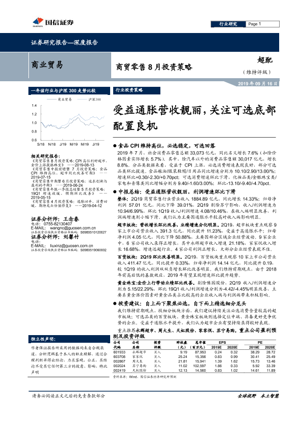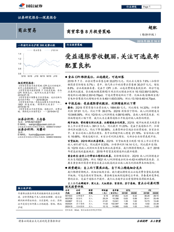 【国信证券】【20190916】商业贸易行业8月投资策略:受益通胀营收靓丽,关注可选底部配置良机-19页