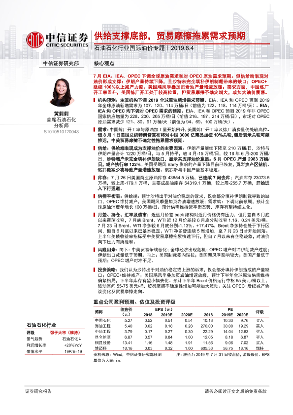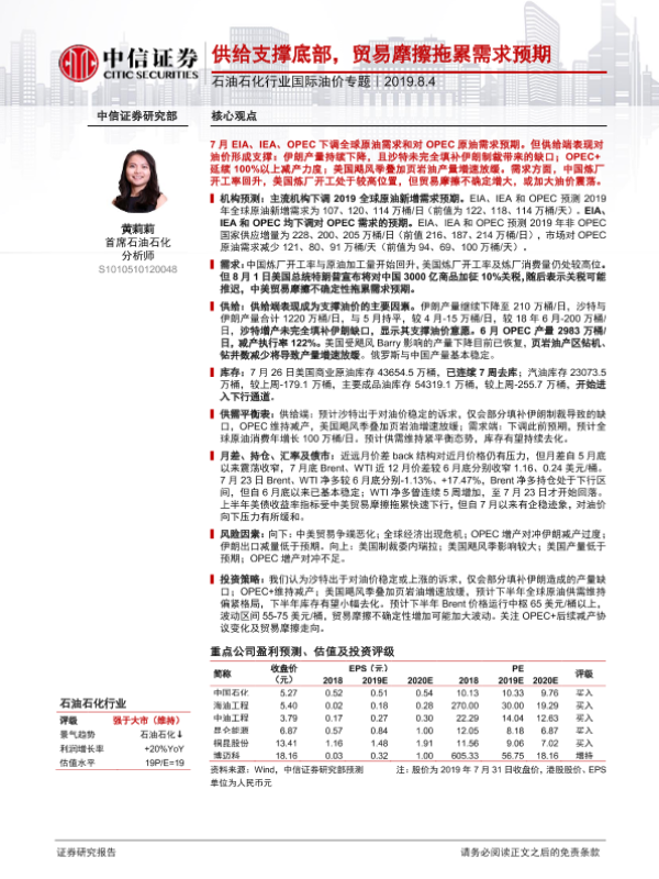 【中信证券】【20190804】石油石化行业国际油价专题:供给支撑底部,贸易摩擦拖累需求预期-19页
