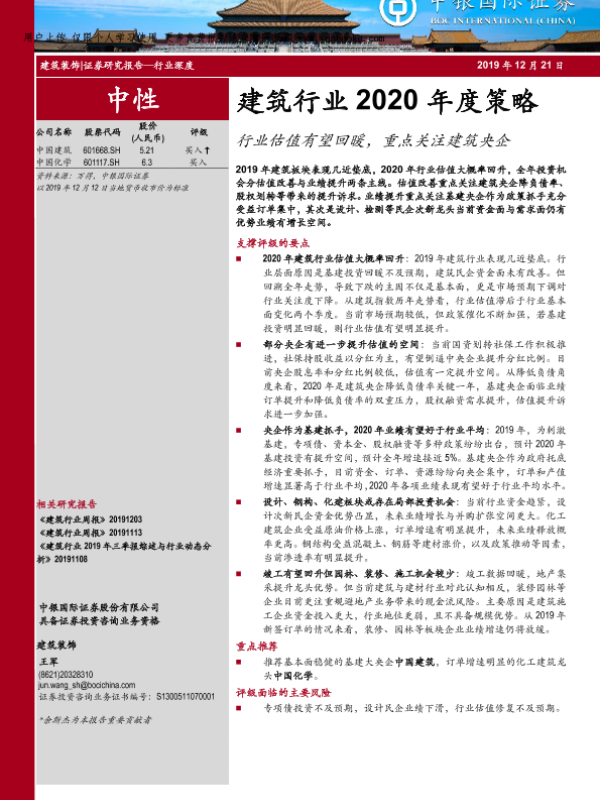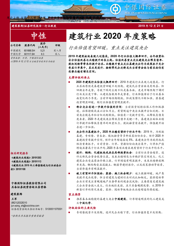 2020年度策略 估值回暖 基建投资 央企 建筑行业
