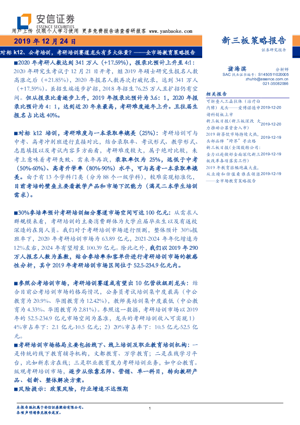 【安信证券】【20191224】全市场教育行业策略报告:对标k12、公考培训,考研培训赛道龙头有多大体量?-20页