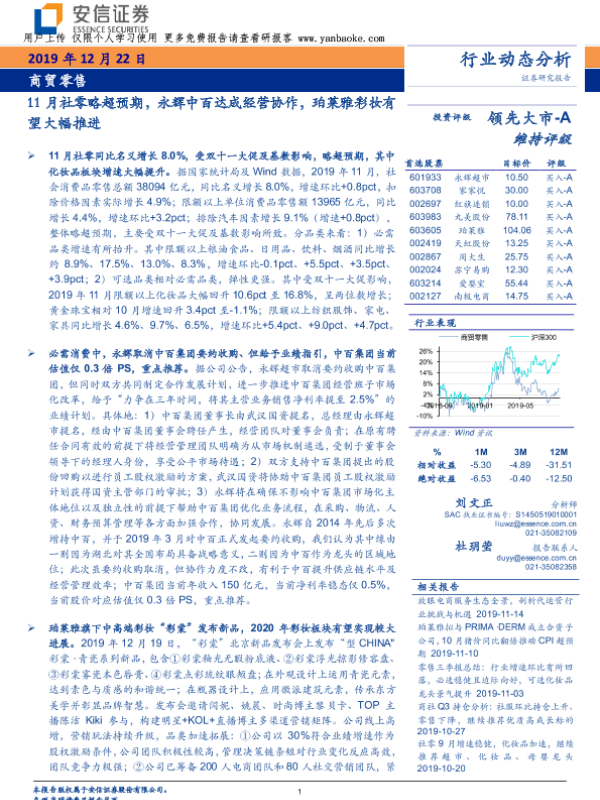 【安信证券】【20191222】11月社零略超预期,永辉中百达成经营协作,珀莱雅彩妆有望大幅推进-22页
