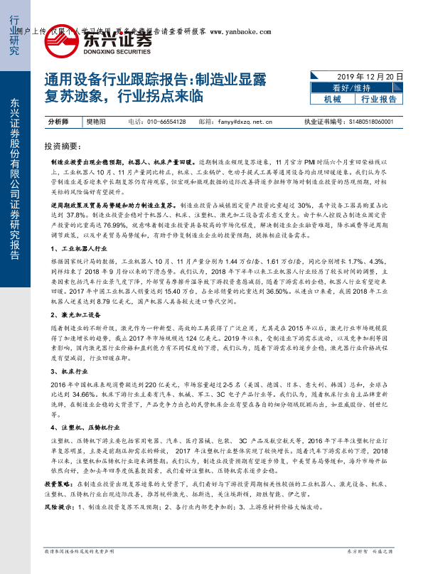 【东兴证券】【20191220】通用设备行业跟踪报告:制造业显露复苏迹象,行业拐点来临-16页