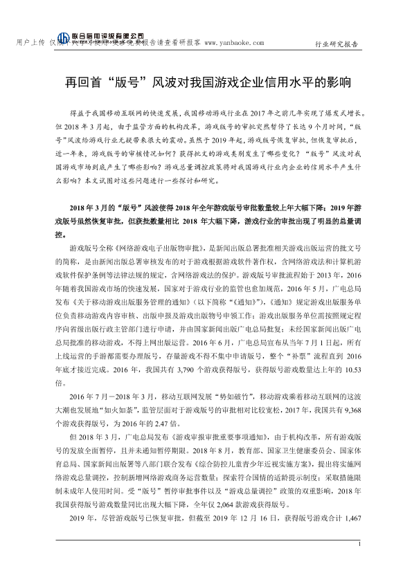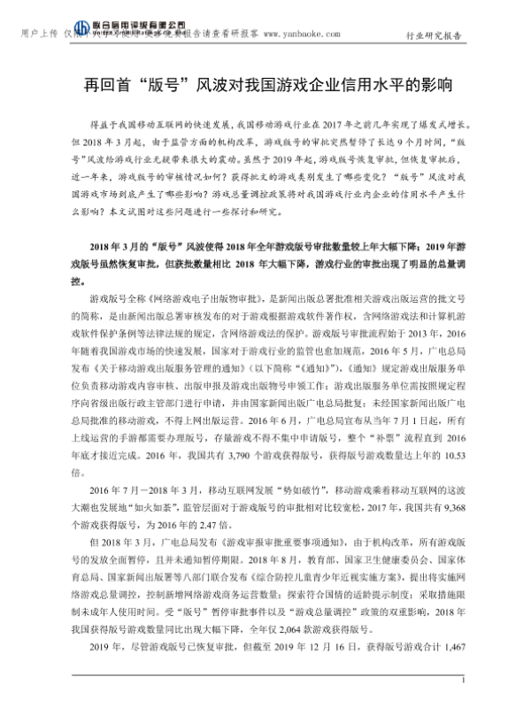 【联合评级】【2019】再回首“版号”风波对我国游戏企业信用水平的影响-6页