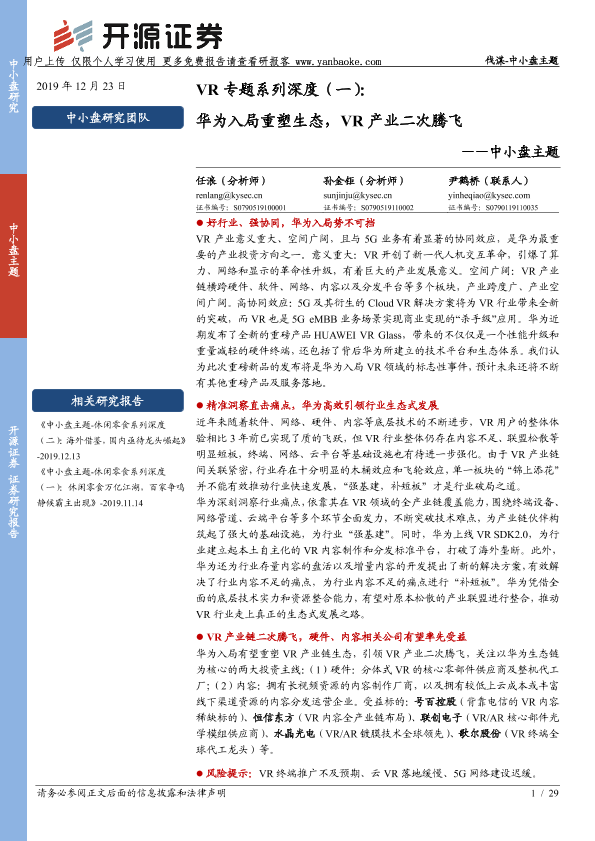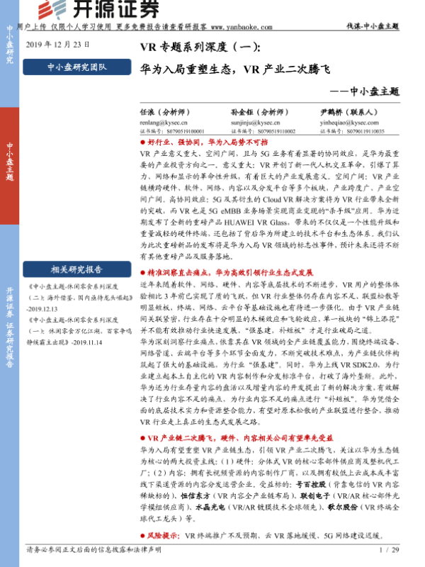 【开源证券】【20191223】中小盘主题:VR专题系列深度(一),华为入局重塑生态,VR产业二次腾飞-29页