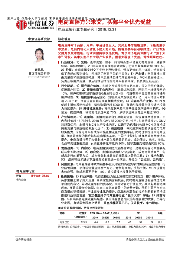 【中信证券】【20191231】电商直播行业专题研究:电商直播方兴未艾,头部平台优先受益-40页