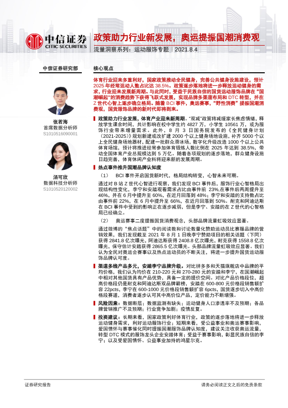 【中信证券】【20210804】纺织服装行业流量洞察系列:运动服饰专题,政策助力行业新发展,奥运提振国潮消费观-12页