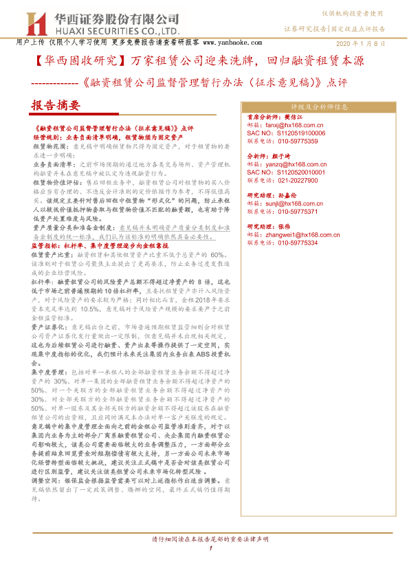 【华西证券】【20200108】《融资租赁公司监督管理暂行办法(征求意见稿)》点评:万家租赁公司迎来洗牌,回归融资租赁本源-10页