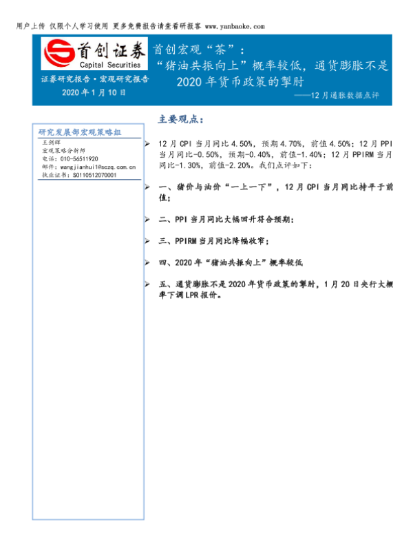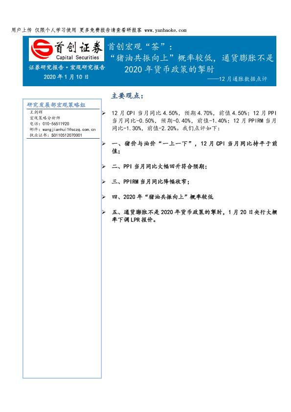【首创证券】【20200110】12月通胀数据点评:宏观“茶”,“猪油共振向上”概率较低,通货膨胀不是2020年货币政策的掣肘-13页