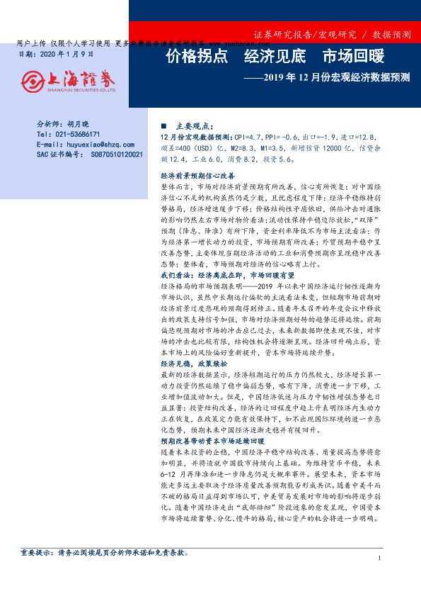 【上海证券】【20200109】2019年12月份宏观经济数据预测:价格拐点,经济见底,市场回暖-14页