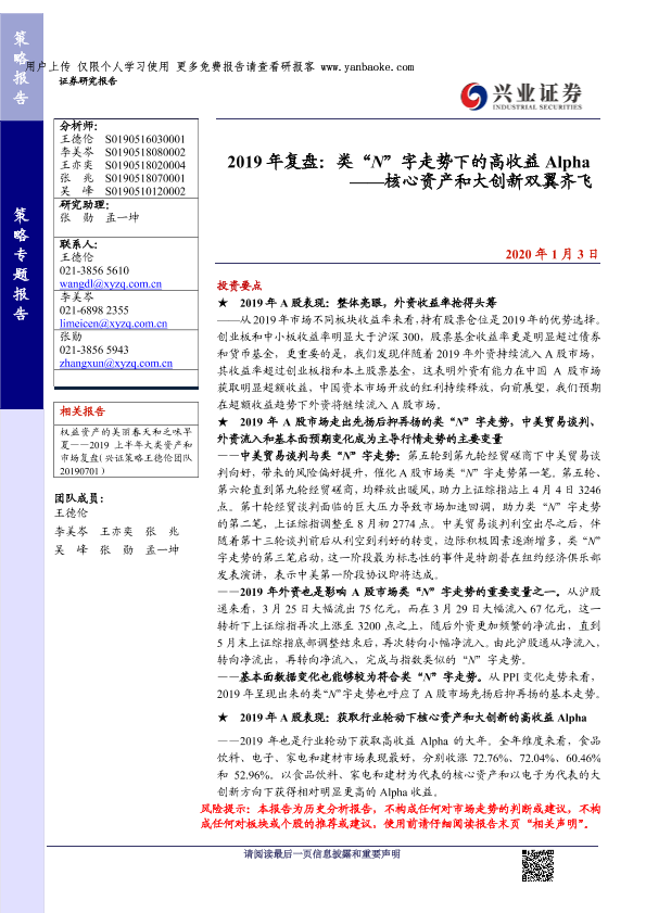【兴业证券】【20200103】2019年复盘:类“N”字走势下的高收益Alpha~核心资产和大创新双翼齐飞-11页