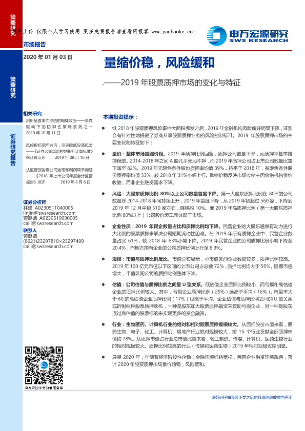【申万宏源】【20200103】2019年股票质押市场的变化与特征:量缩价稳,风险缓和-11页