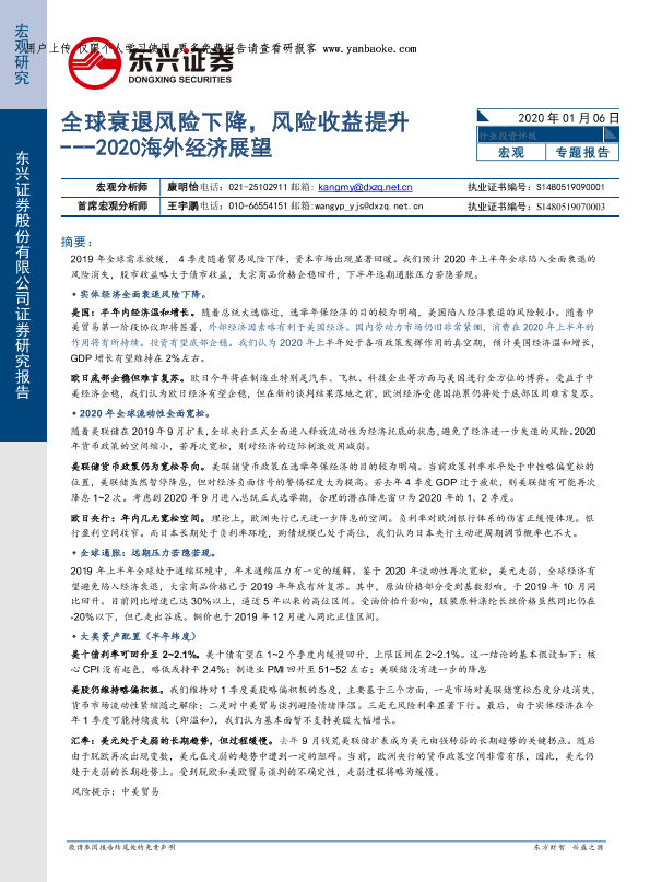 【东兴证券】【20200106】2020海外经济展望:全球衰退风险下降,风险收益提升-21页