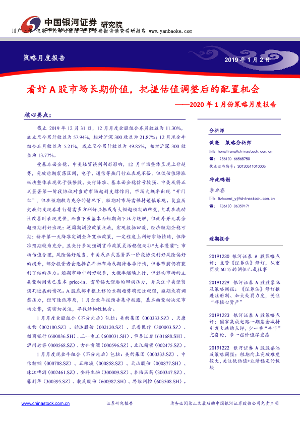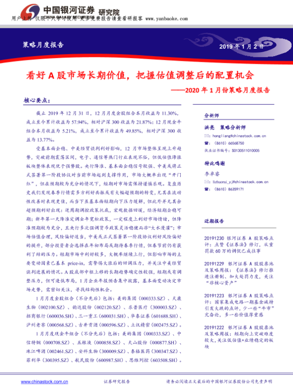 【银河证券】【20190102】2020年1月份策略月度报告:看好A股市场长期价值,把握估值调整后的配置机会-28页