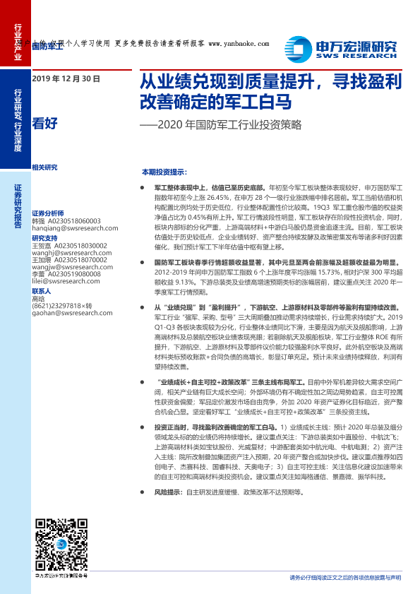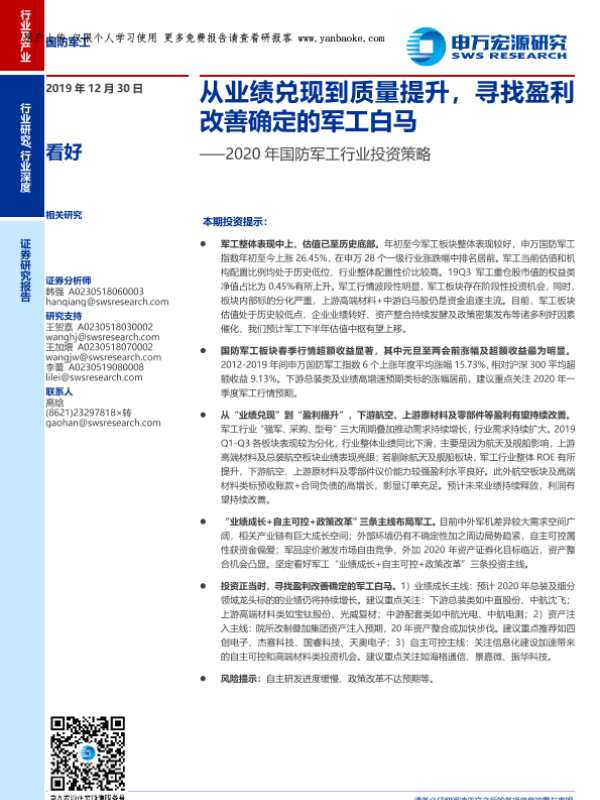 【申万宏源】【20191230】2020年国防军工行业投资策略:从业绩兑现到质量提升,寻找盈利改善确定的军工白马-30页
