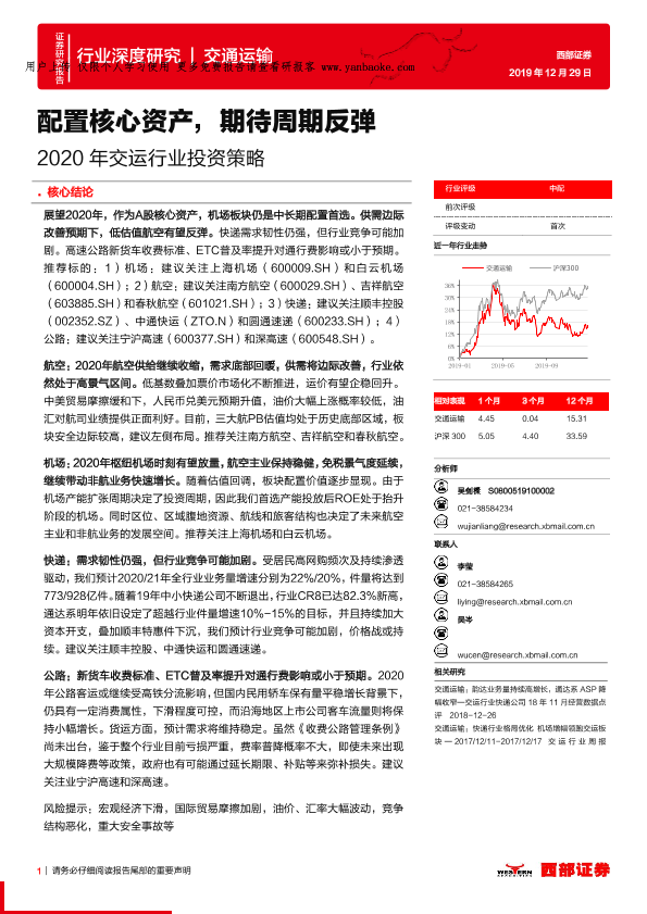 【西部证券】【20191229】2020年交运行业投资策略:配置核心资产,期待周期反弹-60页