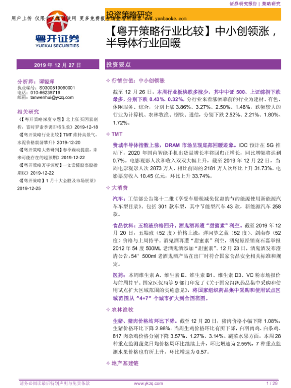 【粤开证券】【20191227】中小创领涨,半导体行业回暖-29页