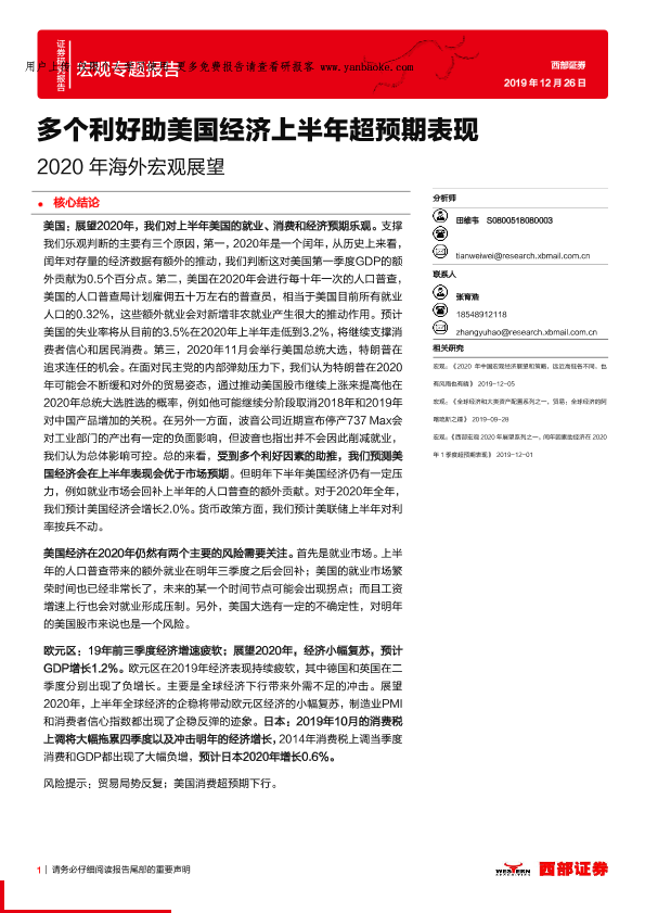 【西部证券】【20191226】2020年海外宏观展望:多个利好助美国经济上半年超预期表现-20页
