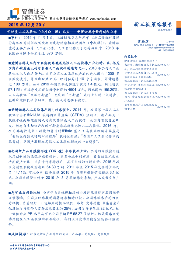 【安信证券】【20191220】爱博诺德申请科创板上市:可折叠人工晶状体(治疗白内障)龙头-22页