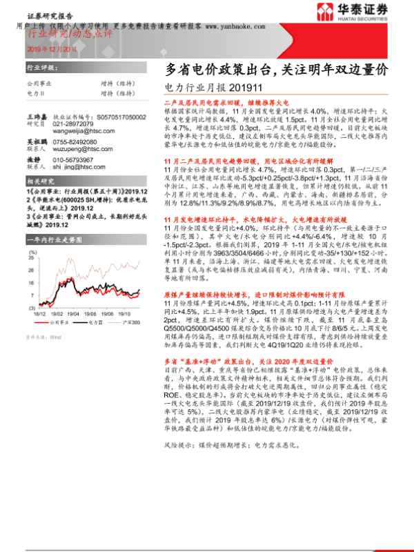 【华泰证券】【20191220】电力行业月报:多省电价政策出台,关注明年双边量价-14页