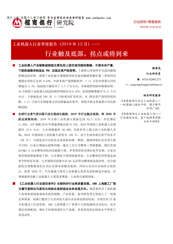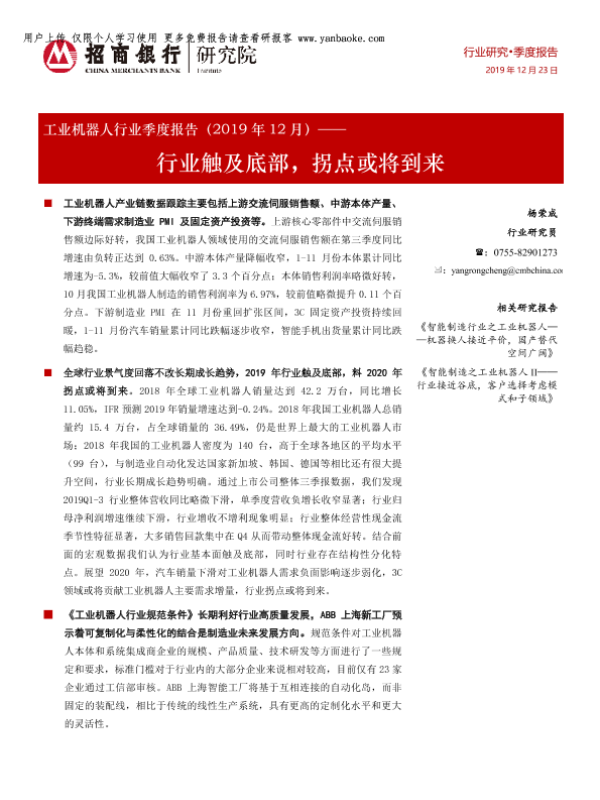 【招商银行】【20191223】工业机器人行业季度报告(2019年12月):行业触及底部,拐点或将到来-18页