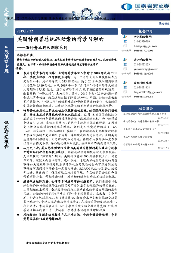 【国泰君安证券】【20191222】美国特朗普总统弹劾案的前景与影响-10页