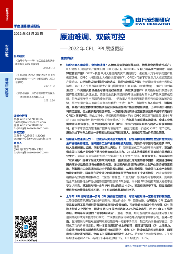 【申万宏源】【20220323】2022年CPI、PPI展望更新:原油难调、双碳可控-29页
