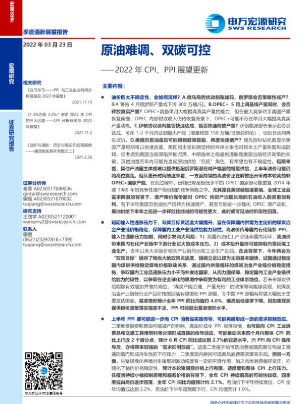 【申万宏源】【20220323】2022年CPI、PPI展望更新:油难调、双碳可控-29页