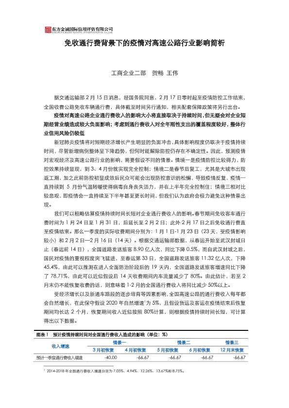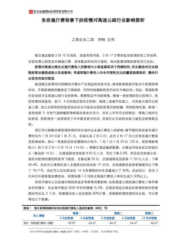【东方金诚】【2020】免收通行费背景下的疫情对高速公路行业影响简析-4页