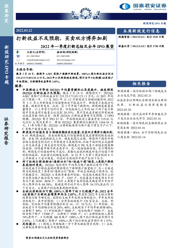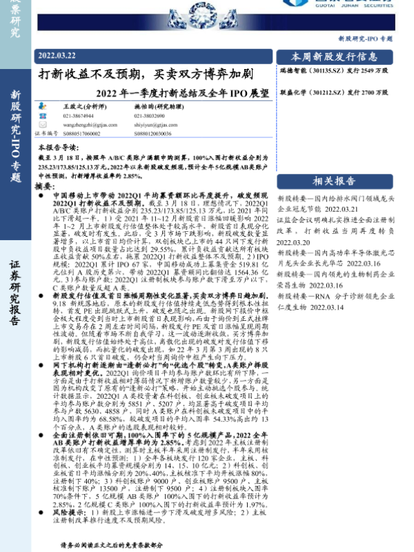 【国泰君安证券】【20220322】2022年一季度打新总结及全年IPO展望:打新收益不及预期,买卖双方博弈加剧-21页
