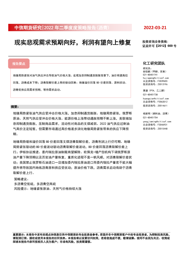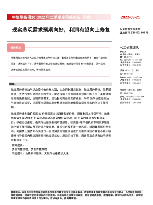 【中信期货】【20220321】2022年二季度度策略报告(沥青):现实悲观需求预期向好,利润有望向上修复-15页
