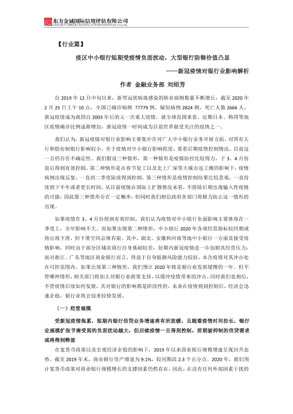 【东方金诚】【2020】新冠疫情对银行业影响解析:疫区中小银行短期受疫情负面扰动,大型银行防御价值凸显-10页