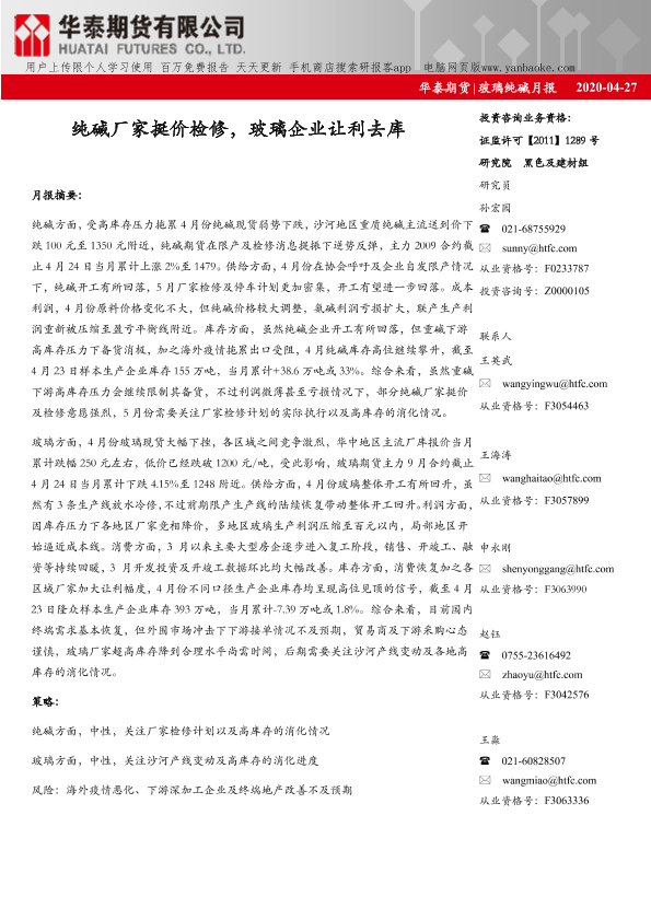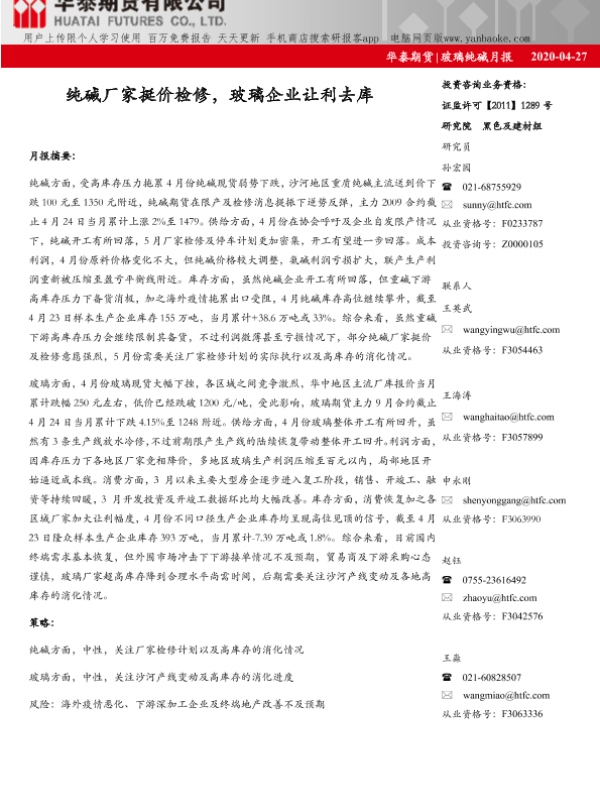 【华泰期货】【20200427】玻璃纯碱月报:纯碱厂家挺价检修,玻璃企业让利去库-12页