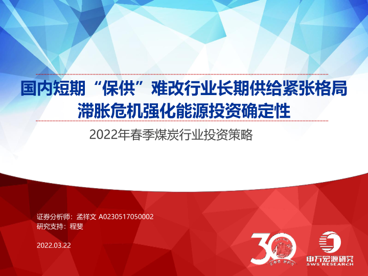 【申万宏源】【20220322】2022年春季煤炭行业投资策略:国内短期“保供”难改行业长期供给紧张格局,滞胀危机强化能源投资确定性-40页