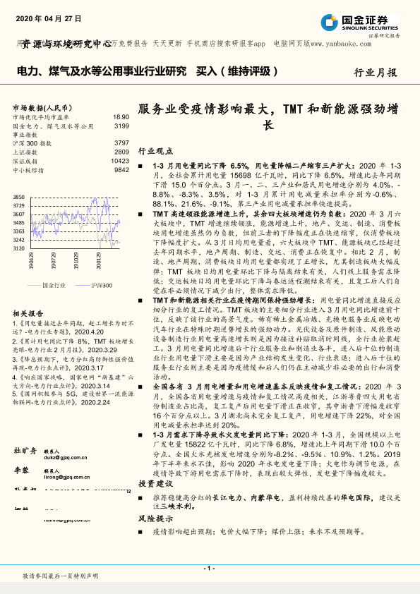 【国金证券】【20200427】电力、煤气及水等公用事业行业月报:服务业受疫情影响最大,TMT和新能源强劲增长-16页