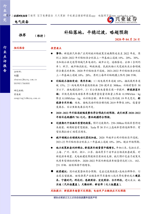 【兴业证券】【20200424】电气设备行业:补贴落地,平稳过渡,略超预期-13页