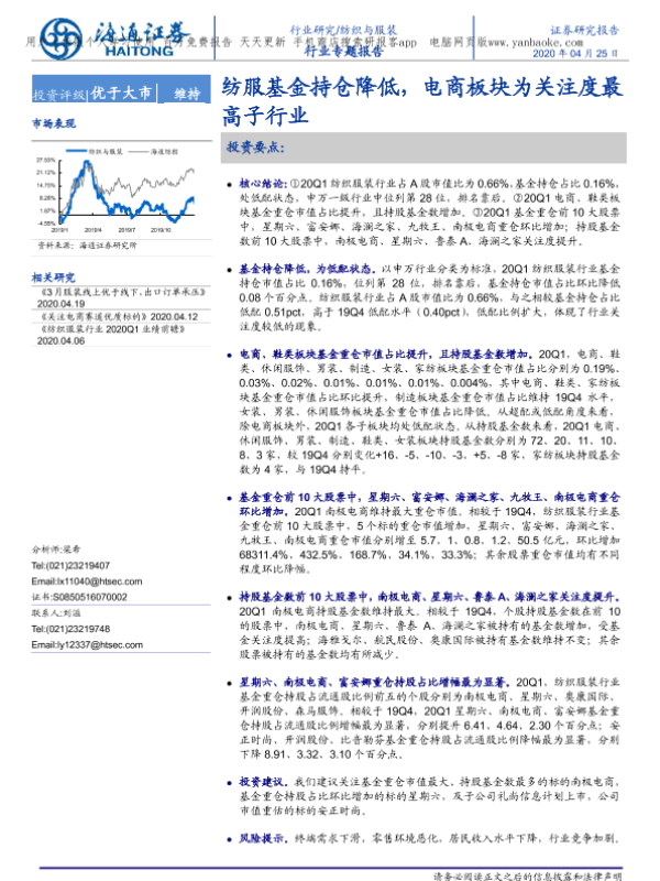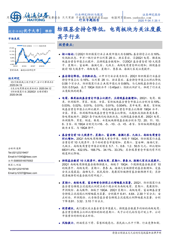 【海通证券】【20200425】纺织与服装行业:纺服基金持仓降低,电商板块为关注度最高子行业-18页