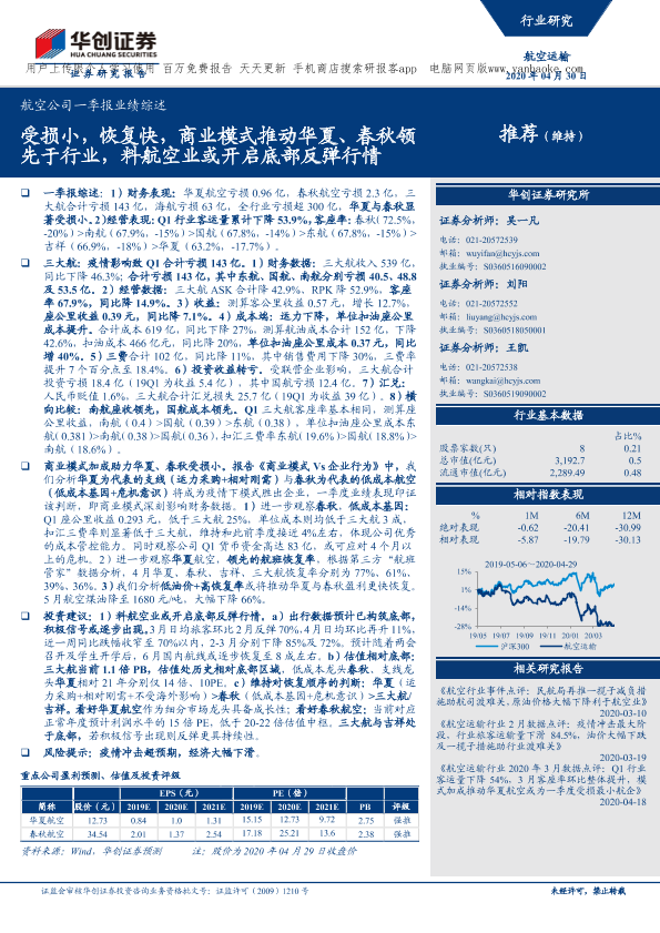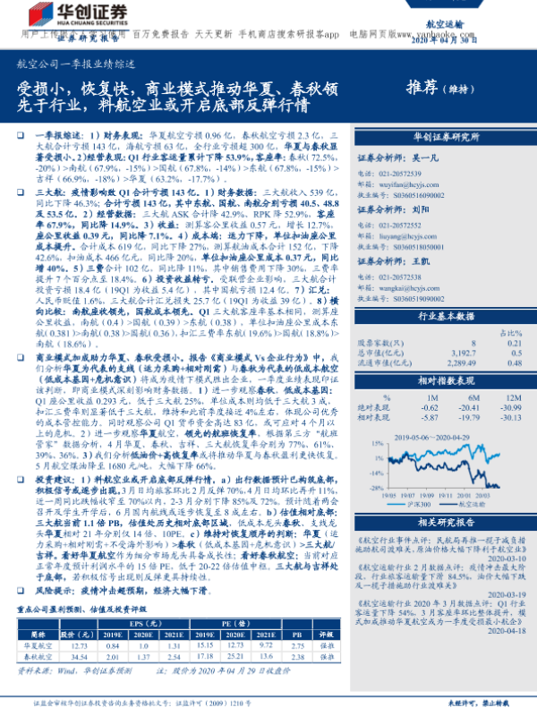 【华创证券】【20200430】航空运输行业航空公司一季报业绩综述:受损小,恢复快,商业模式推动华夏、春秋领先于行业,料航空业或开启底部反弹行情-10页