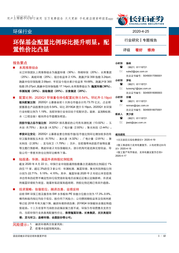 【长江证券】【20200425】环保行业:环保基金配置比例环比提升明显,配置性价比凸显-12页