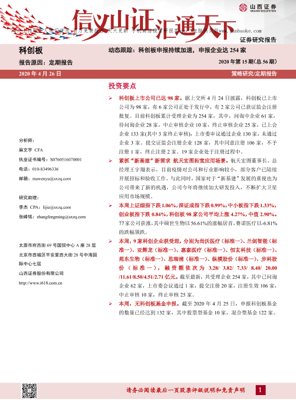 【山西证券】【20200426】科创板动态跟踪2020年第15期(总56期):科创板申报持续加速,申报企业达254家-20页