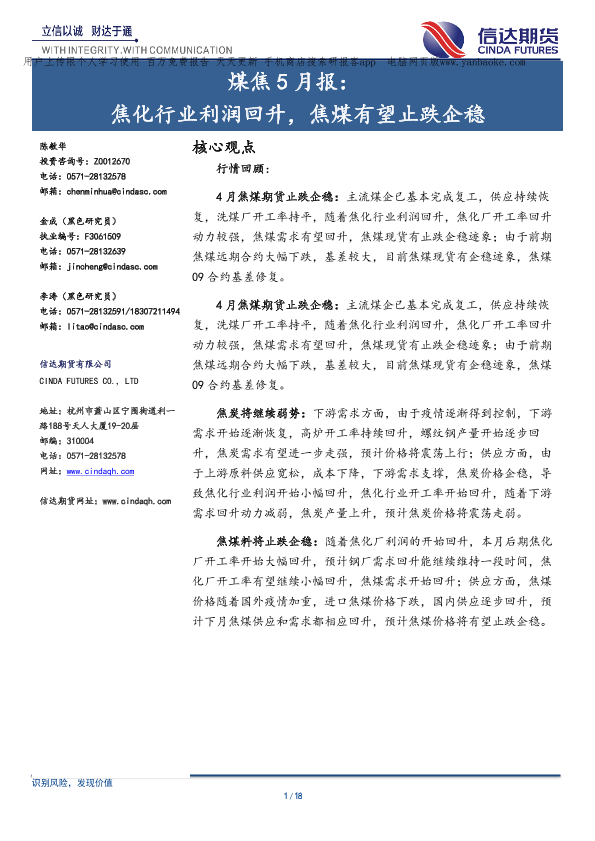 【信达期货】【20200427】煤焦5月报:焦化行业利润回升,焦煤有望止跌企稳-18页