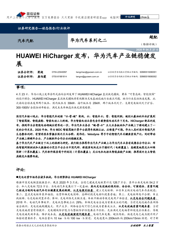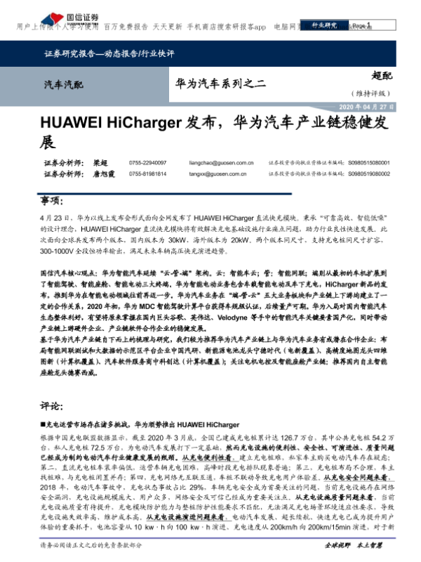 【国信证券】【20200427】汽车汽配行业华为汽车系列之二:HUAWEI_HiCharger发布,华为汽车产业链稳健发展-12页