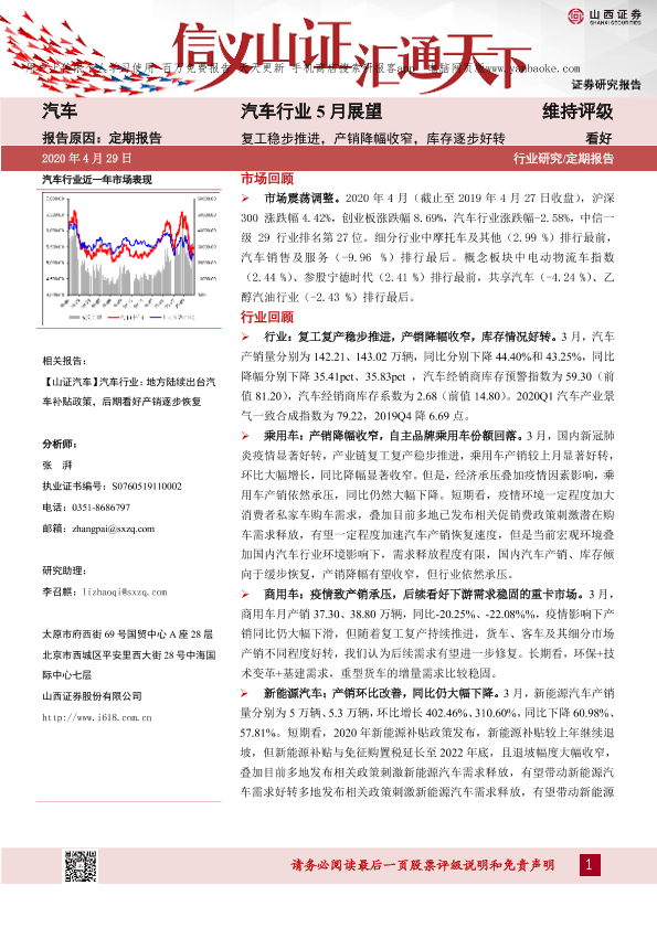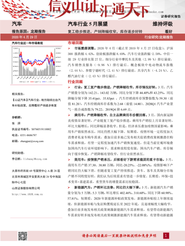 【山西证券】【20200429】汽车行业5月展望:复工稳步推进,产销降幅收窄,库存逐步好转-33页