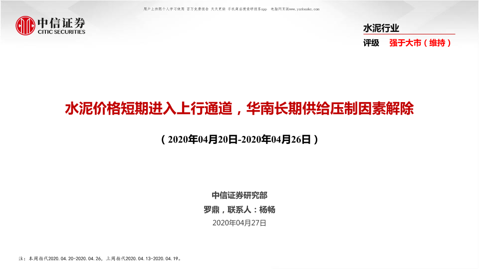 【中信证券】【20200427】水泥行业:水泥价格短期进入上行通道,华南长期供给压制因素解除-38页
