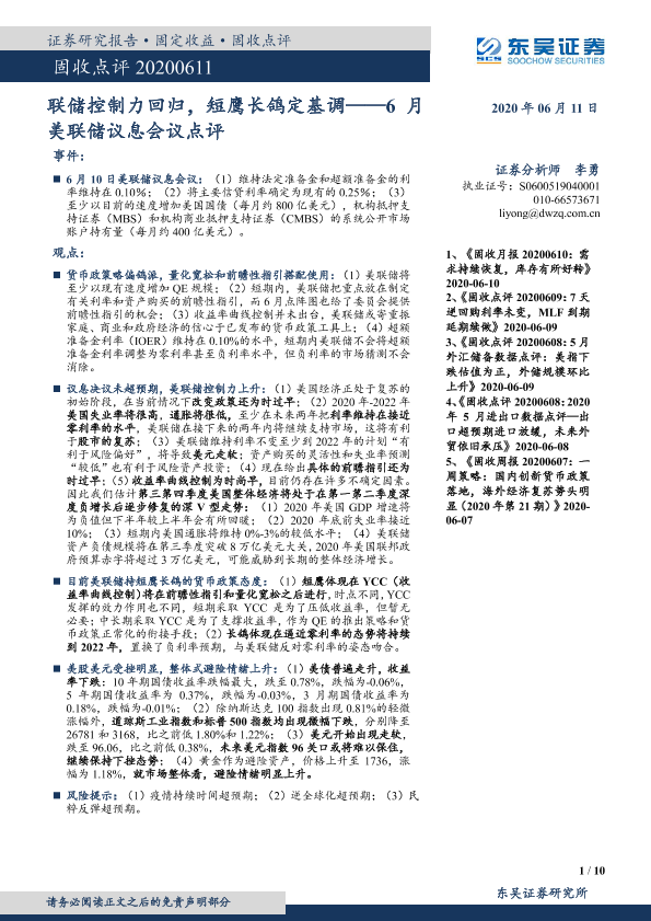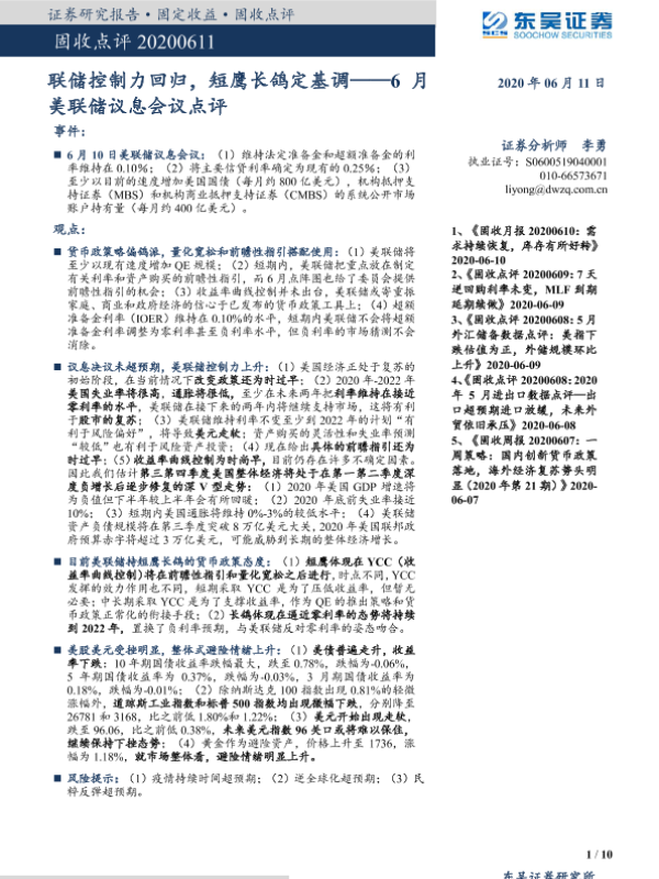【东吴证券】【20200611】6月美联储议息会议点评:联储控制力回归,短鹰长鸽定基调-10页