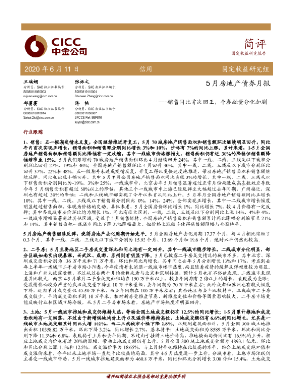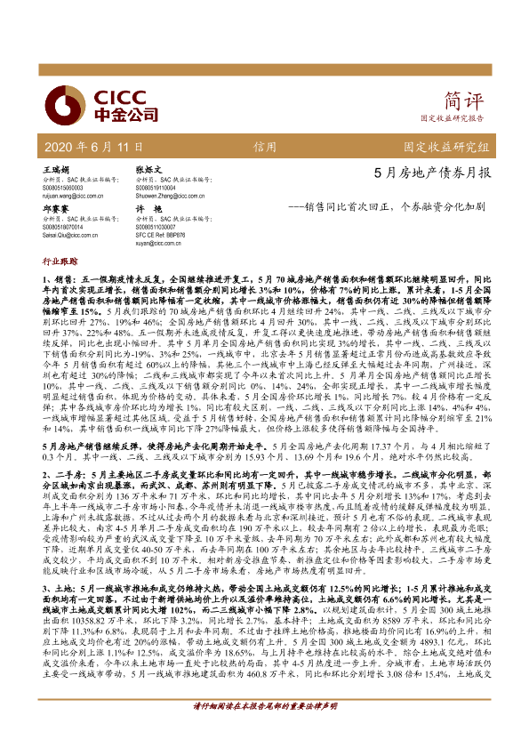 【中金公司】【20200611】5月房地产债券月报:销售同比首次回正,个券融资分化加剧-15页