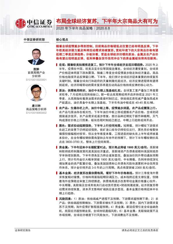 2020年下半年 中信证券 全球经济复苏 商品策略 大宗商品