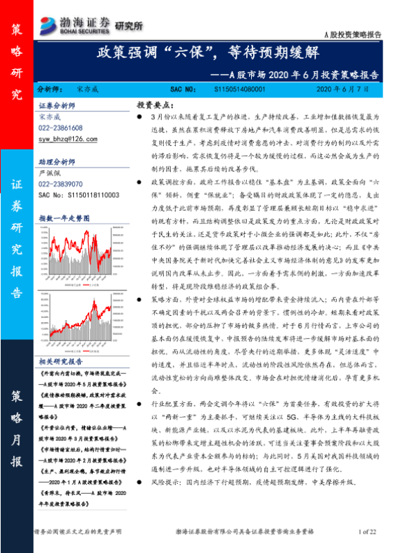 【渤海证券】【20200607】A股市场2020年6月投资策略报告:政策强调“六保”,等待预期缓解-22页