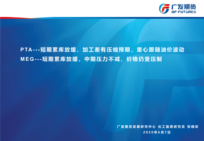【广发期货】【20200607】PTA~短期累库放缓,加工差有压缩预期,重心跟随油价波动;MEG~短期累库放缓,中期压力不减,价格仍受压制-41页