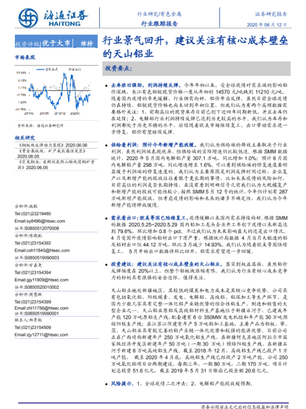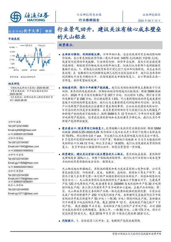 【海通证券】【20200612】有色金属行业跟踪报告:行业景气回升,建议关注有核心成本壁垒的天山铝业-10页